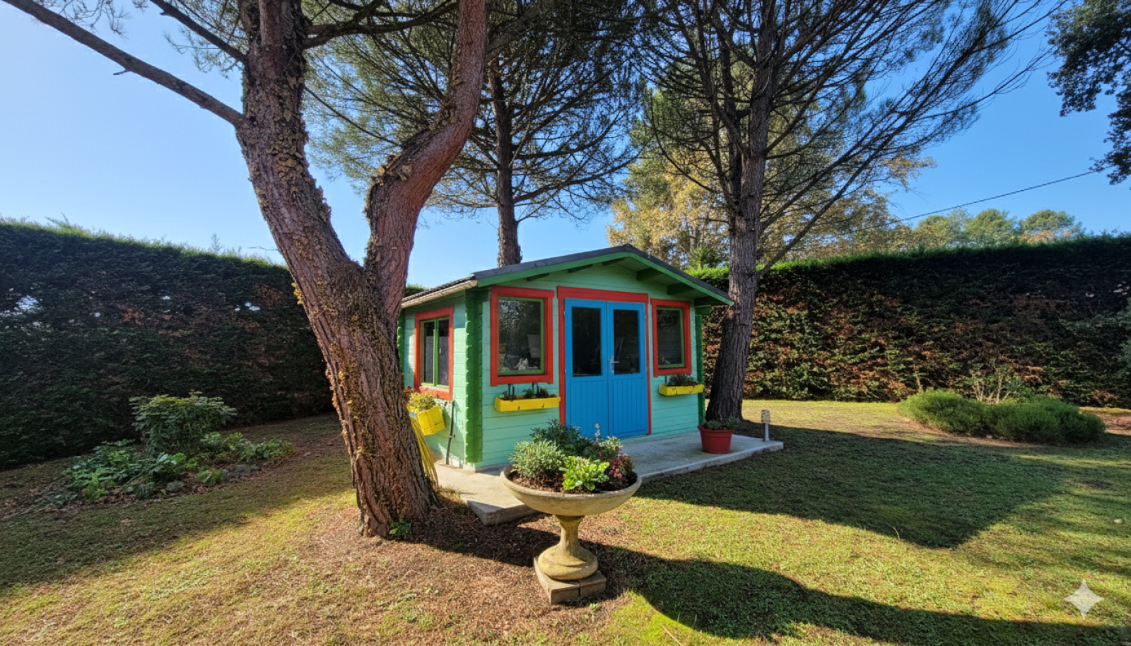 Le bien est implantée sur une parcelle de 2400 m² arborée et agrémentée d'un espace potager et d'un chalet en bois de 12 m² équipée d'eau et d'électricité ainsi que d'une climatisation réversible.