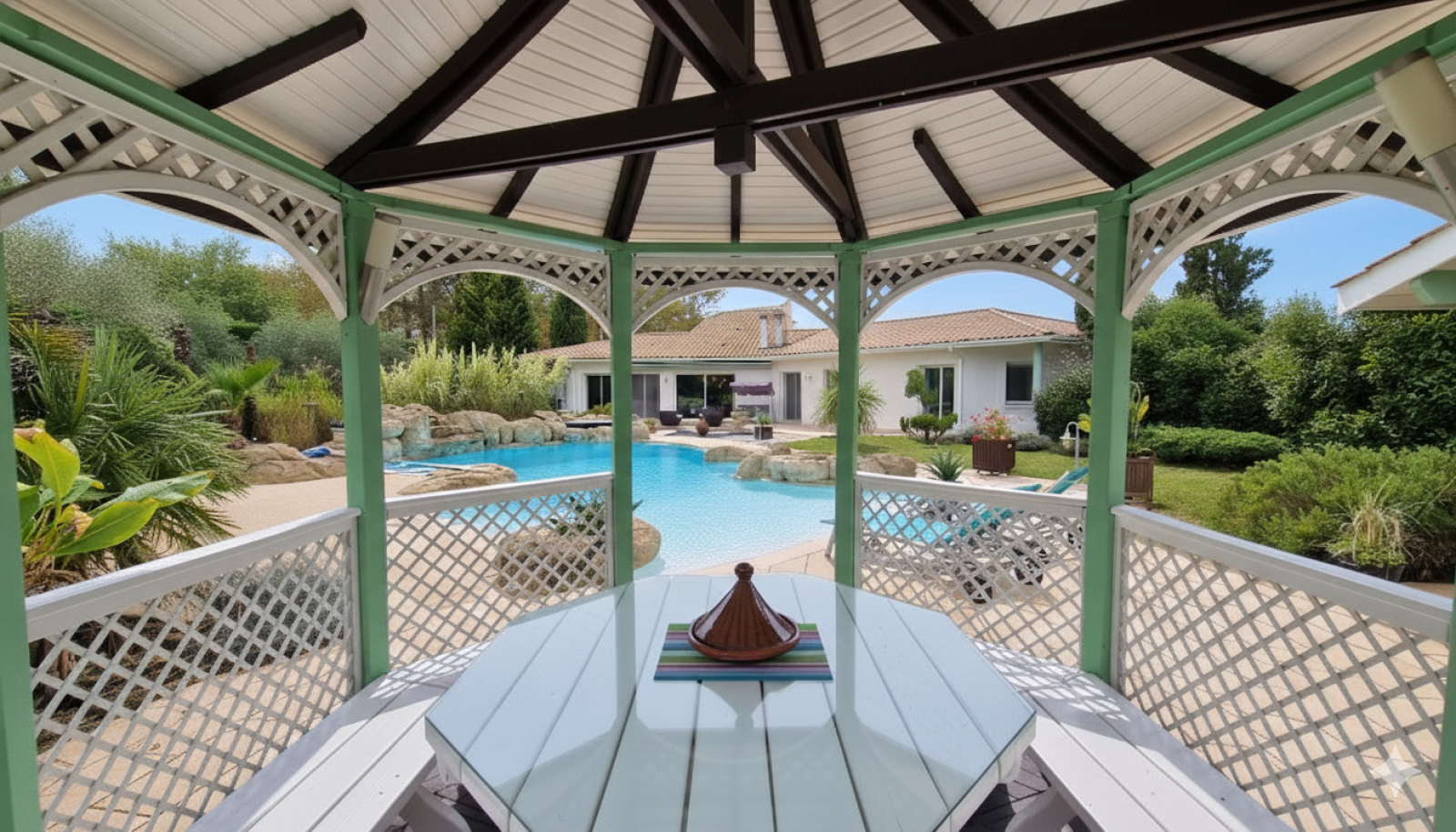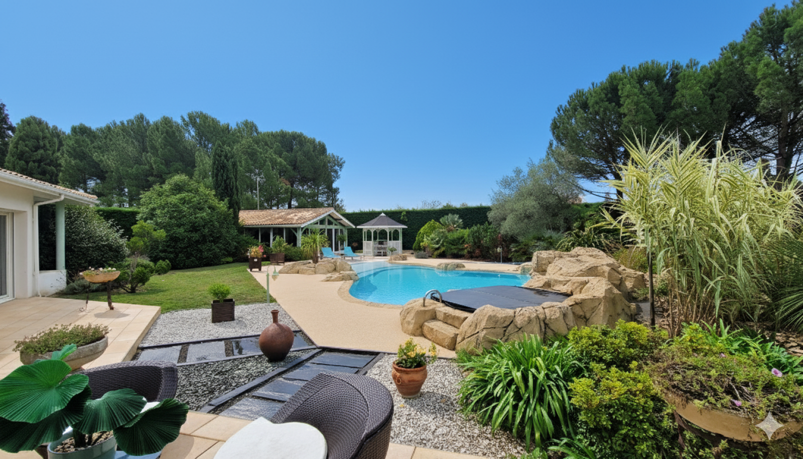 De plus, ce bien dispose d'une salle de sport de 18 m² pouvant être aménagée en studio indépendant pour recevoir votre famiile, ainsi que d'une cuisine d'été de 40 m² pour vos repas au bord de la piscine lagon également équipée d'un spa.
